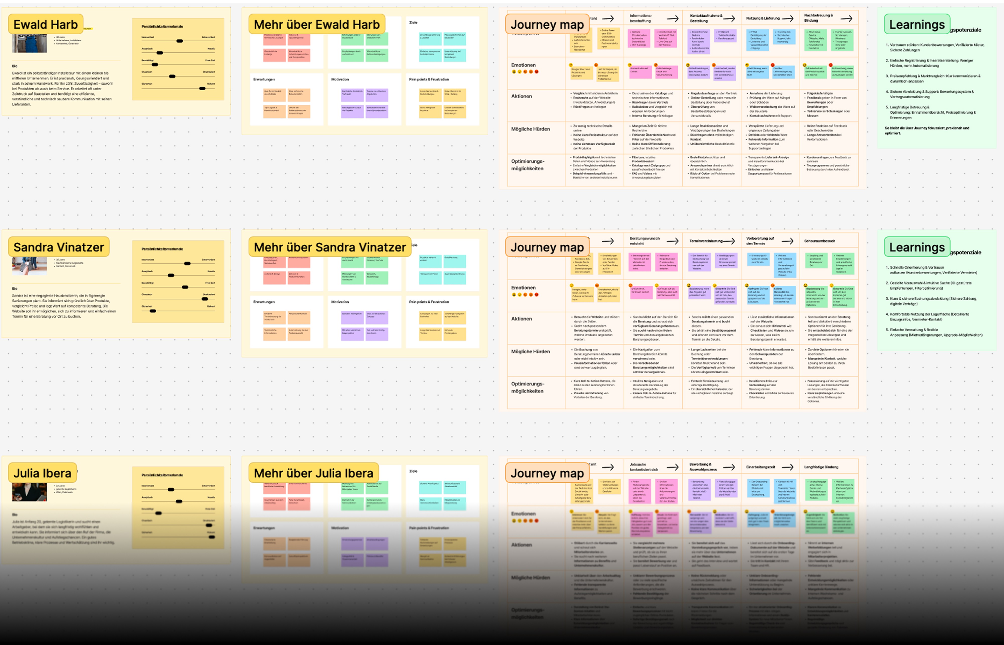 /// The project started with a deep UX foundation: three detailed user personas — a self-employed installer, a private homeowner, and a job seeker — each with their own journey map, pain points, and optimization opportunities. This research directly informed every structural and design decision that followed.